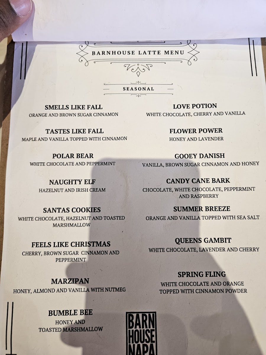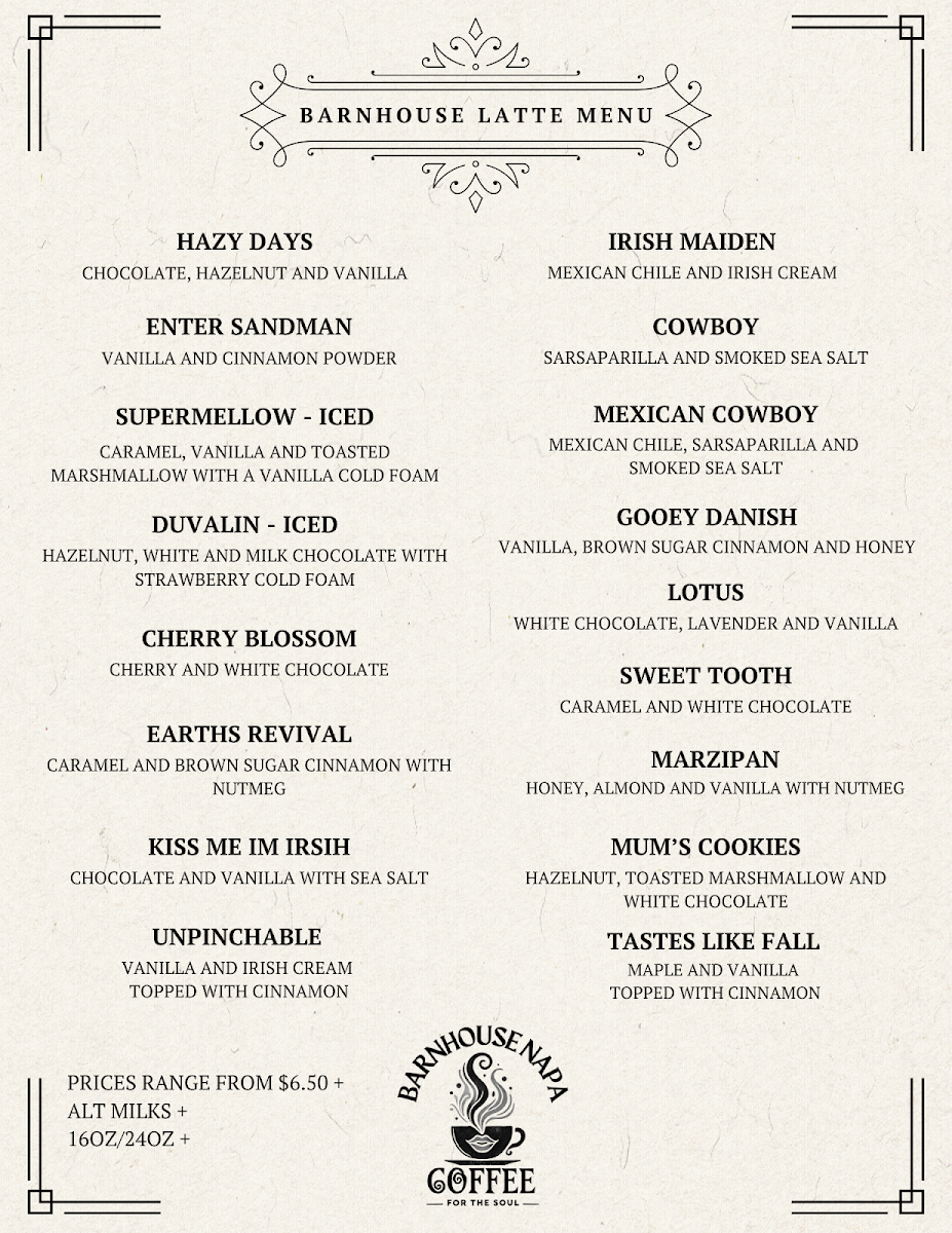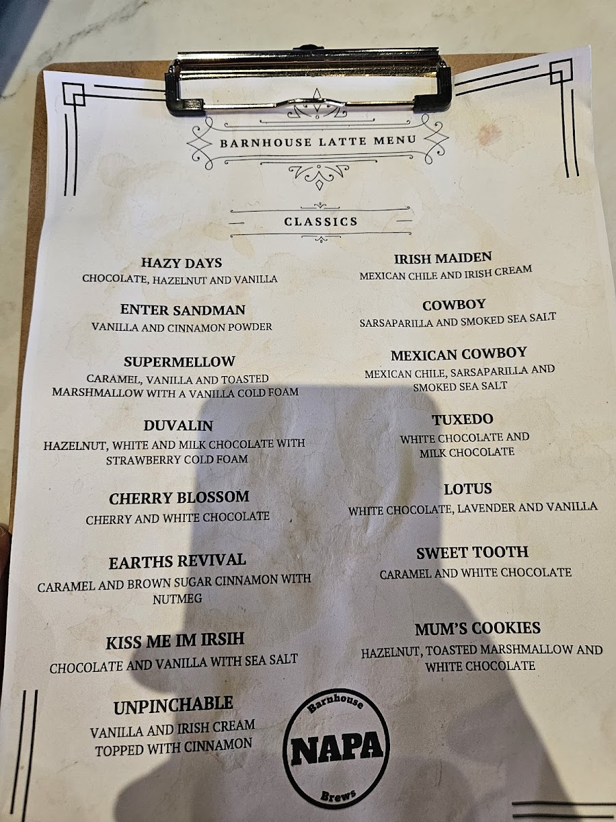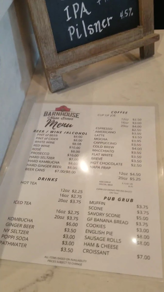 From a reviewer’s perspective, the menu at Barnhouse Napa Coffeehouse And Pub at 1004 Clinton St feels like a thoughtful blend of coffeehouse comfort and pub-style indulgence, tying together creativity and familiarity in a satisfying way. The drinks selection sets an easygoing tone, from simple pours like Glass Of Red, Glass Of While, and Ginger Beer, to the dependable warmth of Cup Of Tea, Espresso, and Americano under the Napa Brews lineup. Beer lovers are well covered with Beers On Tap such as Rose Cider, Coffee Stout, Mango Sour, Double Ipa, and Ipa, which add a relaxed pub character to the space. What really defines the menu, however, is its playful coffee creativity. The Matcha Flight-featuring Strawberry Zen-Cha, Kyoto Cream, Matcha Churro Latte, and Pumpkin Patch Green-offers a tasting-style experience that feels both modern and indulgent. The Barnhouse Latte Menu continues this personality with boldly named options like Hazy Days, Enter Sandman, Irish Maiden, Cowboy, and Supermellow, making each order feel like part of a story rather than just a drink. Classic coffee cravings are well represented too, with Cup Of Joe, Espresso, Americano, Napa Frap, and Mocha providing reliable favorites. The Classics section revisits popular signatures such as Hazy Days, Enter Sandman, Supermellow, Duvalin, and Cherry Blossom, while the Seasonal menu-highlighted by Smells Like Fall, Tastes Like Fall, Love Potion, Flower Power, and Polar Bear-keeps the experience fresh and timely. Rounding everything out, the Others category with Latte, Mocha, Iced, Cold Brew, and Specialties ensures there’s something for every mood. As a conclusion, the Barnhouse menu succeeds in feeling cohesive and memorable, offering a wide-ranging yet well-curated drink experience that comfortably bridges café culture and pub vibes.