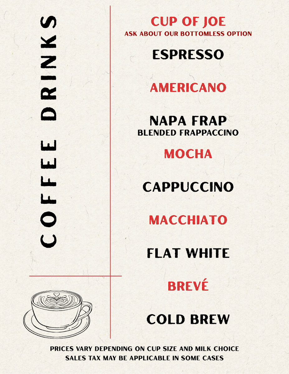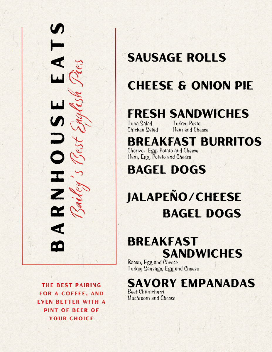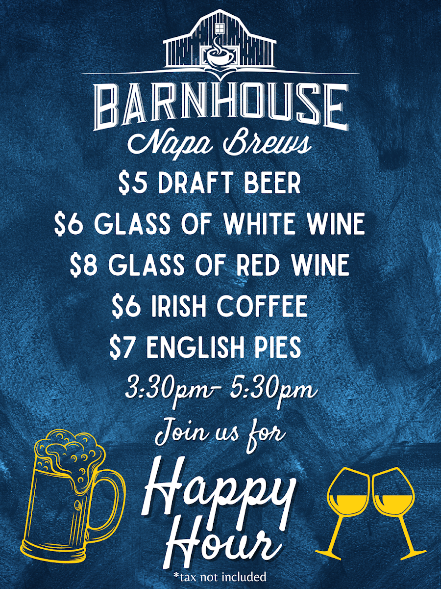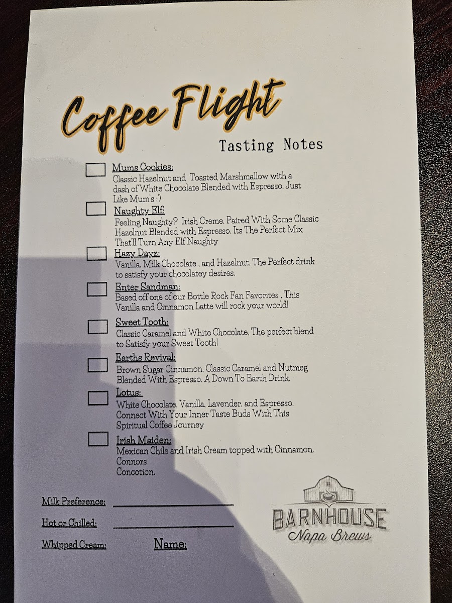 From a reviewer’s perspective, the menu at Barnhouse Napa Coffeehouse And Pub at 1004 Clinton St feels like a thoughtful blend of coffeehouse comfort and pub-style indulgence, tying together creativity and familiarity in a satisfying way. The drinks selection sets an easygoing tone, from simple pours like Glass Of Red, Glass Of While, and Ginger Beer, to the dependable warmth of Cup Of Tea, Espresso, and Americano under the Napa Brews lineup. Beer lovers are well covered with Beers On Tap such as Rose Cider, Coffee Stout, Mango Sour, Double Ipa, and Ipa, which add a relaxed pub character to the space. What really defines the menu, however, is its playful coffee creativity. The Matcha Flight-featuring Strawberry Zen-Cha, Kyoto Cream, Matcha Churro Latte, and Pumpkin Patch Green-offers a tasting-style experience that feels both modern and indulgent. The Barnhouse Latte Menu continues this personality with boldly named options like Hazy Days, Enter Sandman, Irish Maiden, Cowboy, and Supermellow, making each order feel like part of a story rather than just a drink. Classic coffee cravings are well represented too, with Cup Of Joe, Espresso, Americano, Napa Frap, and Mocha providing reliable favorites. The Classics section revisits popular signatures such as Hazy Days, Enter Sandman, Supermellow, Duvalin, and Cherry Blossom, while the Seasonal menu-highlighted by Smells Like Fall, Tastes Like Fall, Love Potion, Flower Power, and Polar Bear-keeps the experience fresh and timely. Rounding everything out, the Others category with Latte, Mocha, Iced, Cold Brew, and Specialties ensures there’s something for every mood. As a conclusion, the Barnhouse menu succeeds in feeling cohesive and memorable, offering a wide-ranging yet well-curated drink experience that comfortably bridges café culture and pub vibes.